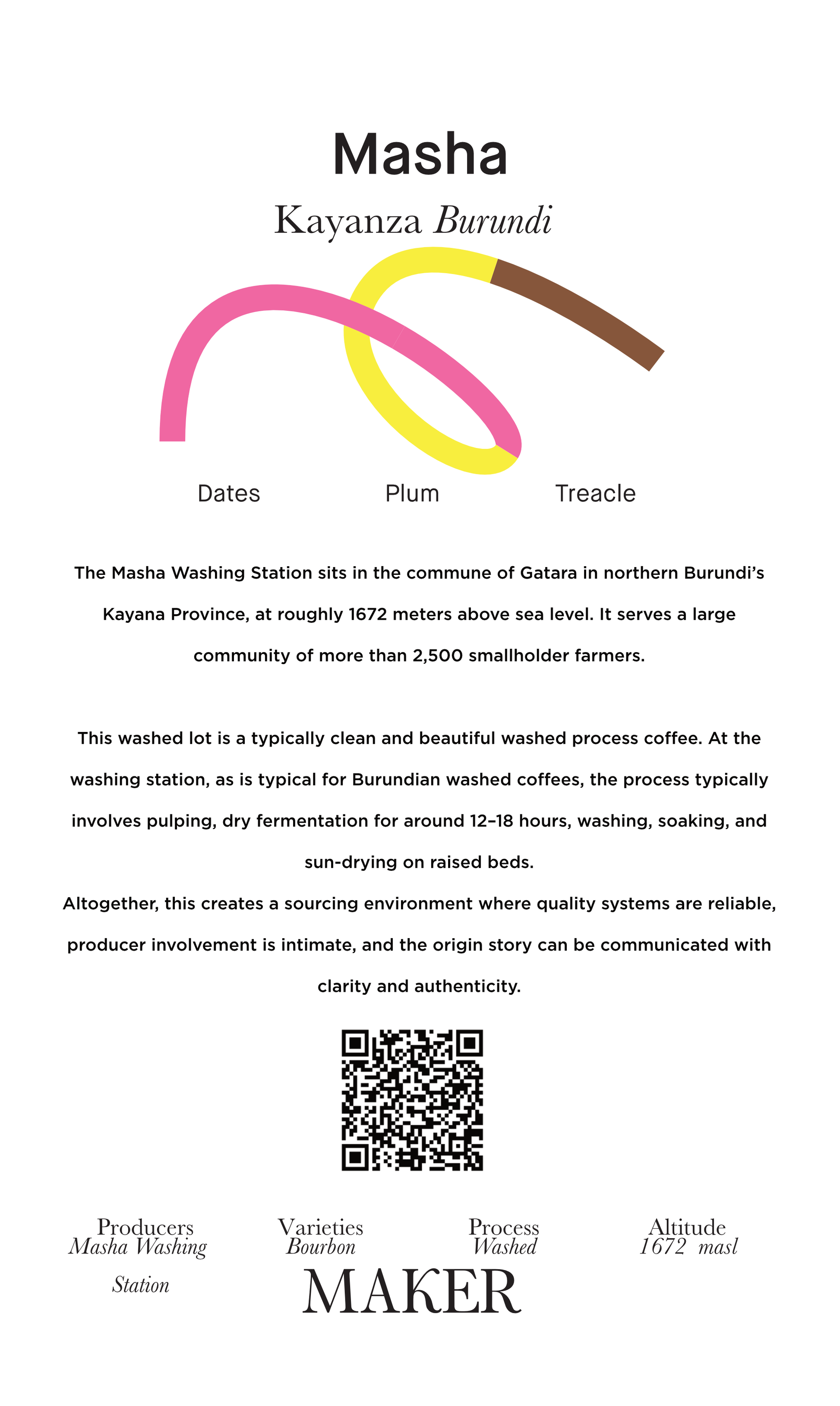 Masha Washing Station, established in 1989, serves a community of more than 2,500 smallholder farmers in the commune of Gatara, northern Burundi. The station's name, derived from the Kirundi word amasho meaning 'herds of cattle', honors the area's pastoral heritage. This community-driven model enables traceable lots and a clear origin story. Most of Burundi's coffee comes from the highlands of Kayanza, where small producers deliver cherries to wet mills like Masha for processing.